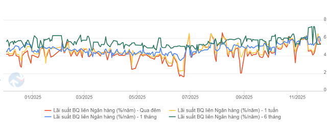 Thanh khoản hệ thống biến động kéo theo lãi suất liên ngân hàng tuần qua tăng vọt. Lãi suất qua đêm bật từ 4.38% cuối tuần trước (21/11) lên 6.4% vào thứ Ba (25/11), sau đó hạ về 5.4% vào ngày 28/11 - tương ứng tăng 102 điểm cơ bản trong 1 tuần. Đáng chú ý, khối lượng giao dịch qua đêm bình quân lên mức kỷ lục hơn 1 triệu tỷ đồng/ngày, tăng hơn 40% so với tuần trước.