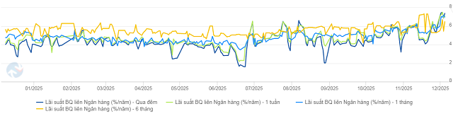 Lãi suất qua đêm tăng từ 5.4% cuối tháng 11 lên mức cao nhất 3 năm 7.48% vào ngày 03/12, trước khi giảm nhẹ về 7.37% cuối tuần 05/12. Khối lượng giao dịch bình quân qua đêm cũng thu hẹp mạnh, giảm hơn 23% sau 1 tuần, từ mức kỷ lục hơn 1 triệu tỷ đồng xuống còn khoảng 792,000 tỷ đồng trong ngày 05/12.