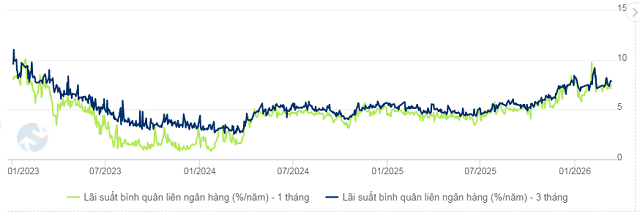 Ngược lại, lãi suất các kỳ hạn dài nhích lên, với kỳ hạn 1 tháng tăng 23 điểm cơ bản lên 7.47% và kỳ hạn 3 tháng tăng 31 điểm cơ bản, đạt 7.87%.