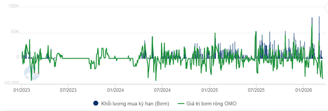Cụ thể, NHNN đã bơm vào hệ thống 47,979 tỷ đồng qua các kỳ hạn từ 7-56 ngày, với lãi suất đồng nhất 4.5%/năm. Chiều ngược lại, lượng đáo hạn trên kênh cho vay cầm cố giấy tờ có giá lên tới 168,943 tỷ đồng. Diễn biến này kéo lượng OMO lưu hành trong hệ thống giảm xuống còn 248,866 tỷ đồng, mức thấp nhất kể từ đầu tháng 2.