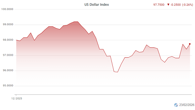 USD mạnh lên trong bối cảnh Tổng thống Donald Trump ngày 21/02 tuyên bố sẽ nâng mức thuế toàn cầu từ 10% lên 15%, chỉ 1 ngày sau khi Tòa án Tối cao bác bỏ phần lớn chương trình thuế quan của ông. Những động thái này làm gia tăng bất ổn trên thị trường tài chính toàn cầu, qua đó hỗ trợ đồng USD trong vai trò tài sản trú ẩn.