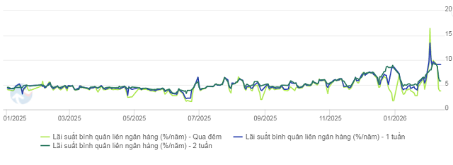 Trước đó, khép lại phiên giao dịch cuối cùng của năm Ất Tỵ (13/02), NHNN chỉ bơm ròng 881 tỷ đồng trên OMO, trong bối cảnh lãi suất liên ngân hàng đồng loạt hạ nhiệt sau giai đoạn tăng nóng vào đầu tháng 2. Trong đó, lãi suất qua đêm giảm mạnh nhất, mất 616 điểm cơ bản, từ 9.92% (phiên 06/02) xuống còn 3.76%. Kỳ hạn 1 tuần và 2 tuần cũng lần lượt giảm 57 và 353 điểm cơ bản, về 9.1% và 5.78%.