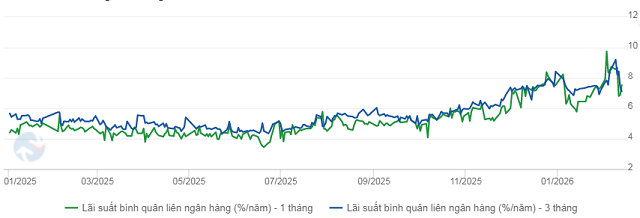 Ở các kỳ hạn dài hơn, lãi suất 1 tháng và 3 tháng cùng lùi về xuống dưới ngưỡng 8%, giảm tương ứng 121 và 145 điểm cơ bản so với tuần trước, dao động trong khoảng 7.13-7.53%.