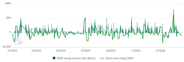 Cụ thể, trong phiên 23/02, Ngân hàng Nhà nước (NHNN) chỉ bơm ra 3,774 tỷ đồng qua kênh cho vay cầm cố giấy tờ có giá với 2 kỳ hạn 14 ngày (1,104 tỷ đồng) và 28 ngày (2,670 tỷ đồng), cùng mức lãi suất 4.5%/năm. Trong khi đó, lượng vốn đáo hạn trên kênh này lên tới 13,349 tỷ đồng, khiến NHNN hút ròng 9,575 tỷ đồng khỏi hệ thống. Qua đó, khối lượng OMO lưu hành trong hệ thống giảm xuống còn 433,742 tỷ đồng.
