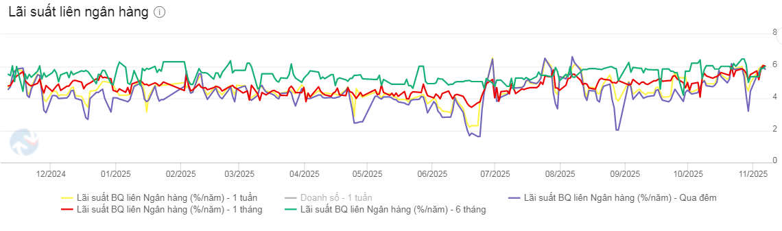 Trên thị trường liên ngân hàng, lãi suất tăng trên tất cả kỳ hạn. Đáng chú ý, lãi suất qua đêm tăng mạnh 137 điểm cơ bản so với cuối tháng 10, lên 5.82%/năm vào ngày 07/11. Tuy nhiên, giá trị giao dịch bình quân qua đêm giảm mạnh so với cuối tháng 10, đạt hơn 695 nghìn tỷ đồng/ngày. Các kỳ hạn 1 tuần - 1 tháng tăng đồng loạt 53-89 điểm cơ bản, dao động quanh 5.87-6.02%/năm, trong khi kỳ hạn 6 tháng tăng lên 5.99%/năm (tăng 64 điểm cơ bản so với cuối tháng 10).