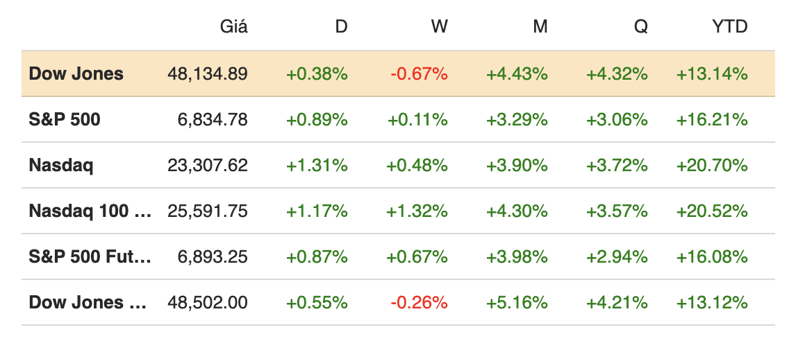 Khép phiên ngày 19/12, chỉ số Nasdaq Composite tăng 1.31%, đóng cửa tại 23,307.62 điểm. S&P 500 tăng 0.88%, chốt phiên ở mức 6,834.50 điểm, trong khi Dow Jones Industrial Average tăng 183.04 điểm, tương đương 0.38%, lên 48,134.89 điểm. Đây là phiên tăng thứ hai liên tiếp của cả ba chỉ số chính.