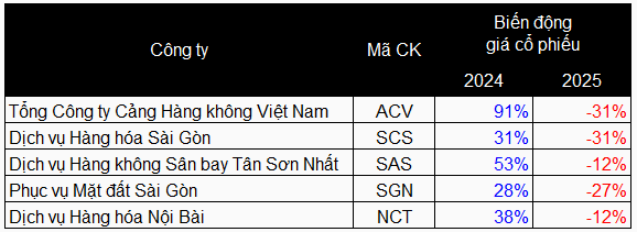 Một loạt cổ phiếu đầu ngành dịch vụ hàng không như ACV, SCS, SGN đã giảm giá từ 27-32% trong năm nay, trong khi các mã khác như SAS và NCT cũng giao dịch kém tích cực. Diễn biến này đặc biệt đáng chú ý trong bối cảnh khách quốc tế đến Việt Nam cao kỷ lục và sản lượng vận chuyển hàng hóa hàng không vẫn khả quan.