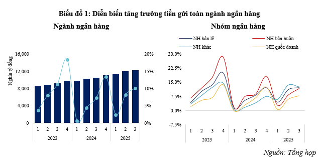 Nhóm ngân hàng bán lẻ theo sát với mức tăng trưởng 12.19%, được hỗ trợ bởi tỷ trọng huy động cá nhân lớn và sự phục hồi của dòng tiền dân cư trong bối cảnh lãi suất duy trì ở mức phù hợp. Ngược lại, nhóm ngân hàng bán buôn bắt đầu chững lại sau giai đoạn bứt tốc mạnh trong hai năm trước, đạt tăng trưởng lũy kế 11.75%. Với đặc thù tỷ trọng tiền gửi doanh nghiệp lớn và các chuỗi vốn tài trợ, nhóm này chịu ảnh hưởng trực tiếp từ tốc độ tăng trưởng tiền gửi doanh nghiệp đang suy yếu, khiến động lực mở rộng huy động không còn mạnh mẽ như giai đoạn trước.