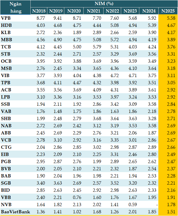 VPBank là ngân hàng có hệ số NIM cao nhất, đạt 5.58%; kế đến là HDBank (HDB, 4.67%), KienlongBank (KLB, 4.17%), MB (MBB, 3.89%) và Techcombank (TCB, 3.67%).