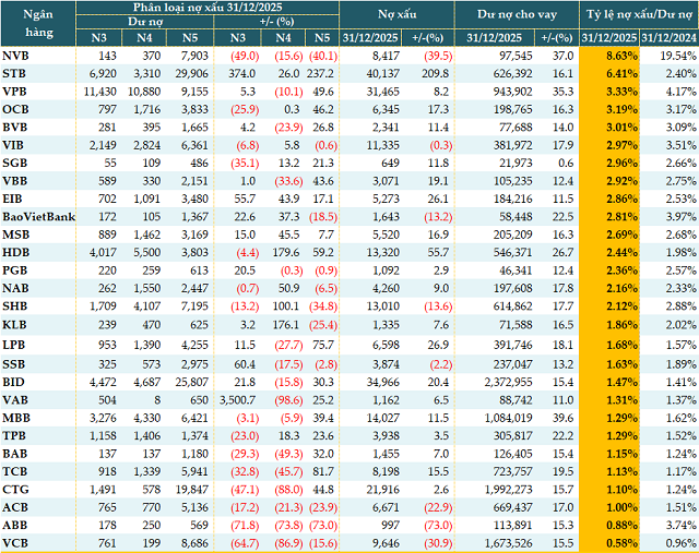 Chất lượng nợ vay của các ngân hàng tính đến 31/12/2025 (Đvt: Tỷ đồng)