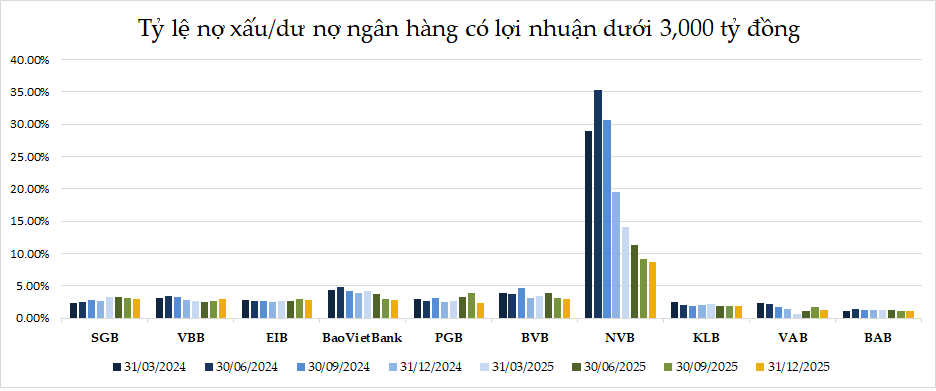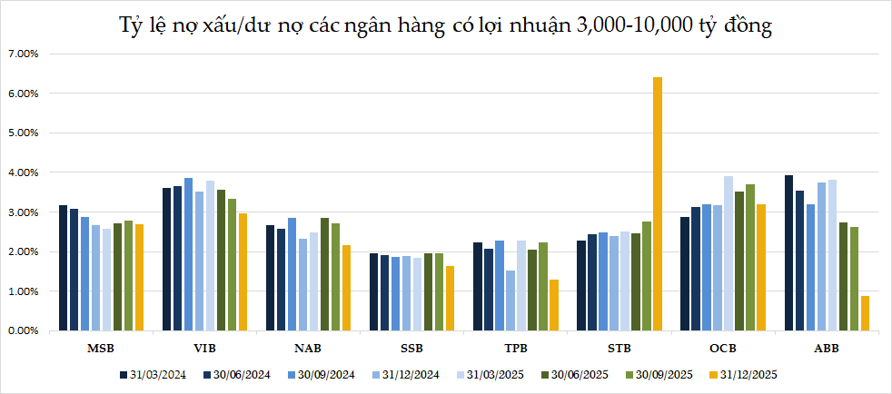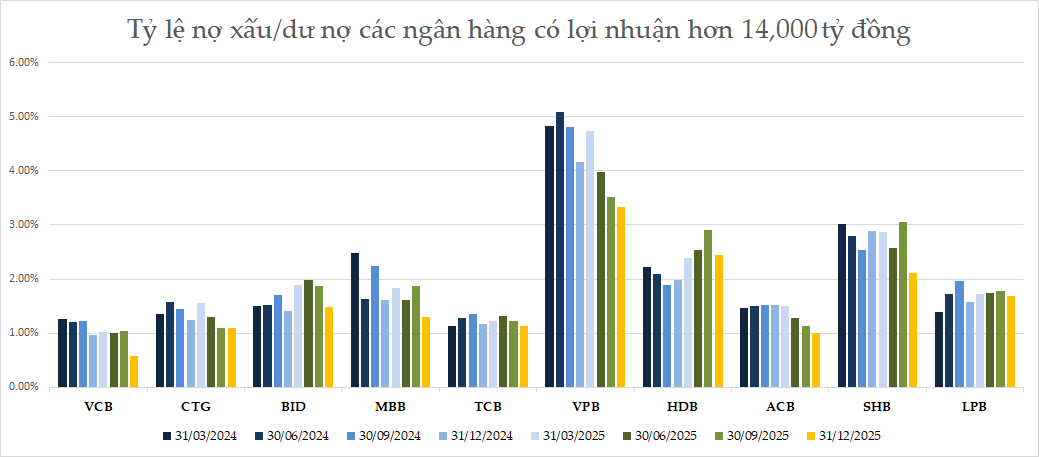 Thứ ba, dữ liệu theo quý trong năm 2025 cho thấy xu hướng điều hành rủi ro nhìn chung khả quan. Mặt bằng nợ xấu ngân hàng theo quý đã giảm ở phần lớn nhà băng, cuối quý 4/2025 bình quân quanh 1.72%, với nhiều ngân hàng lớn còn dưới 1.5%. Tuy nhiên, rủi ro tập trung vẫn hiện hữu ở một số ngân hàng đang tái cơ cấu. Nghĩa là rủi ro không còn là câu chuyện đồng đều toàn hệ thống mà là câu chuyện cấu trúc danh mục và khẩu vị tín dụng theo từng ngân hàng.