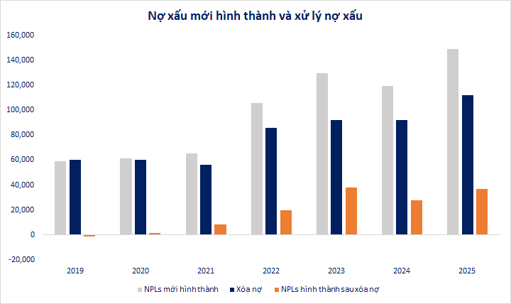 Thứ tư, dữ liệu nợ xấu mới hình thành và xử lý nợ xấu củng cố quan điểm trung tính nghiêng về phía tích cực. Từ năm 2022 đến 2025, nợ xấu mới hình thành đều ở mức cao, nhưng giá trị xóa nợ cũng tăng đáng kể, cho thấy ngành đã chủ động xử lý và sẵn sàng hy sinh một phần lợi nhuận để giữ an toàn bảng cân đối. Phần nợ xấu còn lại sau xử lý vẫn cao hơn giai đoạn trước 2021, tức áp lực chưa biến mất, nhưng việc xử lý không bị chậm lại. Đây là điểm quan trọng, vì trong môi trường tín dụng tăng nhanh, chất lượng tín dụng bền vững phụ thuộc nhiều vào tốc độ nhận diện và xử lý nợ hơn là mục tiêu làm đẹp tỷ lệ ngắn hạn.