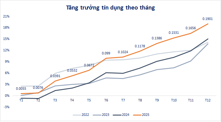 Thứ nhất, năm 2025 là năm tăng trưởng tín dụng rất cao. Tăng trưởng theo tháng lên tới 19.01% vào tháng 12, trong khi mốc đến 27/11 đã là 16.56% và nhiều ngân hàng gần chạm room tín dụng. Khi dư nợ tăng nhanh, mẫu số phình to sẽ tạo hiệu ứng làm dịu tỷ lệ nợ xấu, vì vậy mức giảm nhẹ của tỷ lệ chưa đủ để kết luận chất lượng tài sản cải thiện.