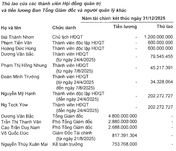 Thù lao của các lãnh đạo NVL cho thấy, tiền lương của Tổng Giám đốc Dương Văn Bắc năm 2025 cao nhất với 4.8 tỷ đồng.