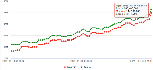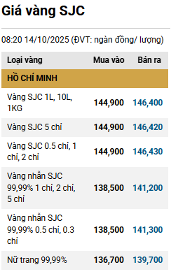 Trong nước, sáng 14/10, giá vàng miếng được Công ty SJC niêm yết ở mức 144.9 - 146.4 triệu đồng/lượng theo chiều mua - bán, tăng 2.8 triệu đồng và 2.3 triệu đồng/lượng mỗi chiều. Giá vàng nhẫn cũng lên mức 142.3 - 144.5 triệu đồng/lượng ở chiều mua - bán. Nếu so với giá thế giới, giá vàng miếng trong nước đang chênh hơn 14 triệu đồng/lượng.