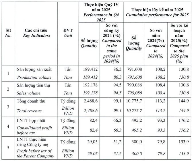 Lũy kế cả năm 2025, sản lượng sản xuất và tiêu thụ của BFC đều vượt hơn 8% so với năm trước, đạt gần 792 tỷ đồng và hơn 790 tỷ đồng. Vì vậy, tổng doanh thu tăng hơn 13% lên gần 10.8 ngàn tỷ đồng, tuy nhiên lãi trước thuế hợp nhất lại đi lùi gần 7% còn hơn 495 tỷ đồng.
