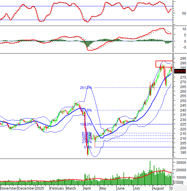 Hiện tại, HNX-Index giảm sau khi kiểm tra lại đỉnh cũ tháng 8/2025 (tương đương vùng 285-292 điểm) trong bối cảnh chỉ báo MACD tiếp tục suy yếu sau khi cho tín hiệu bán. Nếu tình hình không có sự cải thiện và nhịp điều chỉnh vẫn diễn ra thì vùng hỗ trợ gần nhất của chỉ số là đáy cũ tháng 8/2025 (tương đương vùng 264-270 điểm).