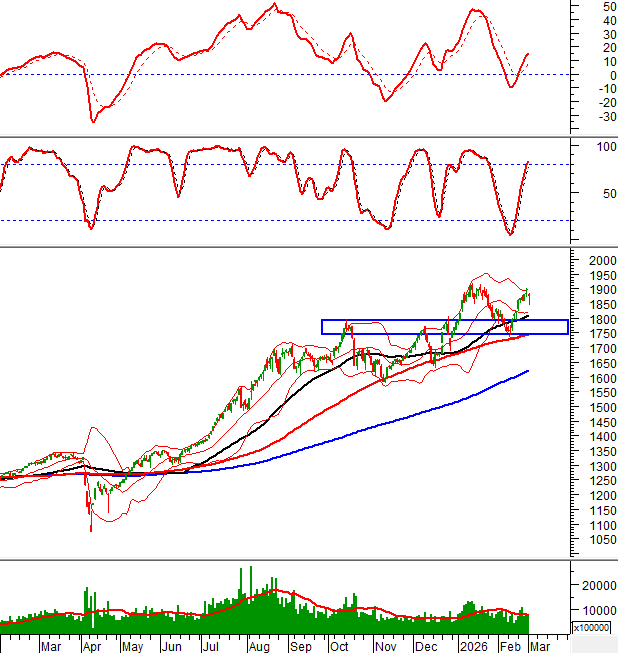 VN-Index tiếp tục rung lắc mạnh khi test lại đỉnh cũ tháng 01/2026 (tương đương vùng 1,880-1,918 điểm). HNX-Index giảm và nhận được sự hỗ trợ từ đường Middle của Bollinger Bands.