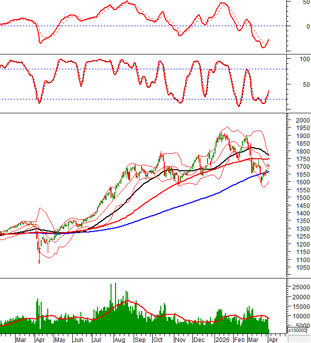 Trong phiên giao dịch sáng ngày 02/04/2026, VN-Index điều chỉnh nhẹ và vẫn đang nằm trên đường SMA 200 ngày và Middle của Bollinger Bands.