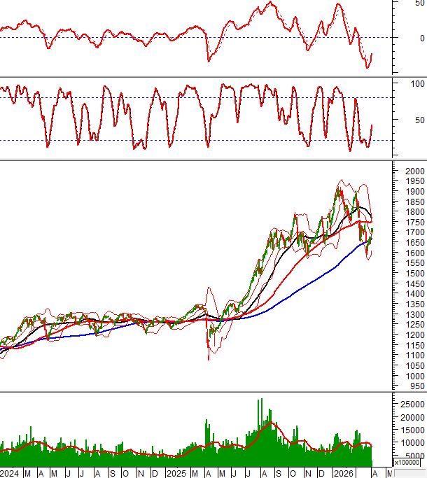 Dải Bollinger Bands tiếp tục thu hẹp khoảng cách trong khi chỉ báo ADX tiếp tục giảm và đang nằm trong vùng xám (20<ADX<25). Điều này cho thấy khả năng cao VCG sẽ diễn biến đi ngang kèm theo các phiên tăng giảm đan xen trong thời gian tới.