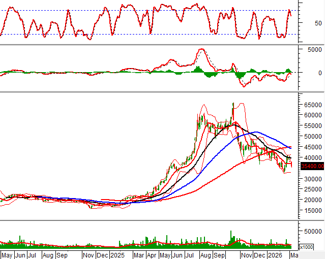 Trong phiên giao dịch sáng ngày 04/03/2026, HNX-Index rơi xuống dưới đường Middle của Bollinger Bands.