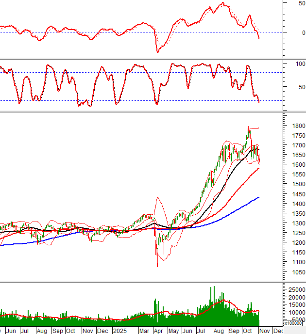 Hiện tại, chỉ báo MACD tiếp tục suy yếu và nằm dưới mức 0 sau khi cho tín hiệu bán trong bối cảnh giá cổ phiếu này tiếp tục bám sát dải dưới (Lower Band) của Bollinger Bands.
