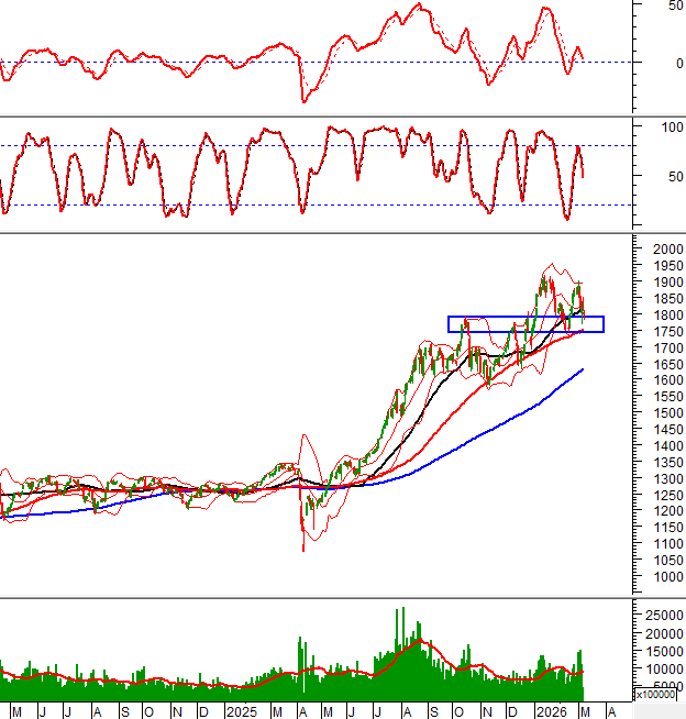VN-Index giằng co mạnh đồng thời xuất hiện mẫu hình nến có bóng mờ dài trong bối cảnh đang test lại vùng hỗ trợ 1,750-1,805 điểm. HNX-Index đã rơi xuống dưới đường Middle của Bollinger Bands.