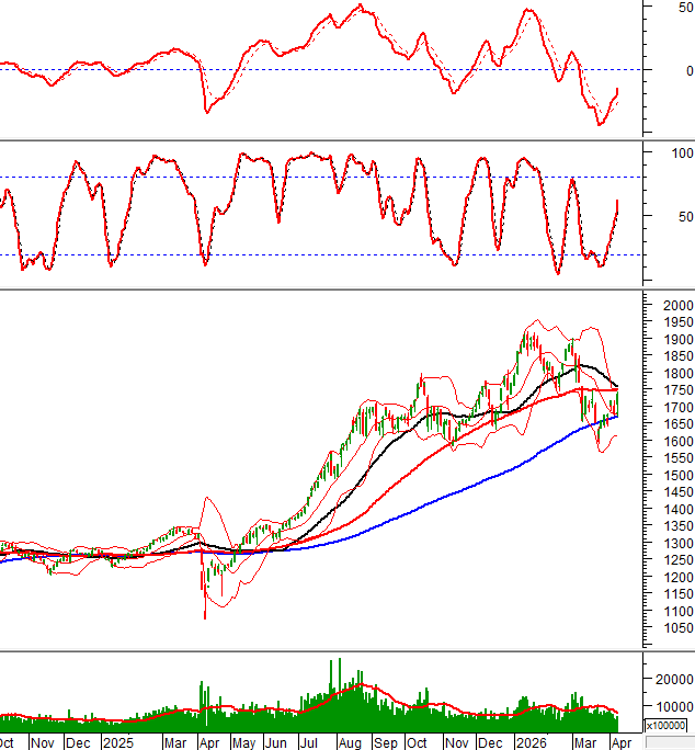 Trong phiên giao dịch sáng ngày 08/04/2026, HNX-Index cũng đảo chiều mạnh và vượt qua đường Middle của Bollinger Bands.