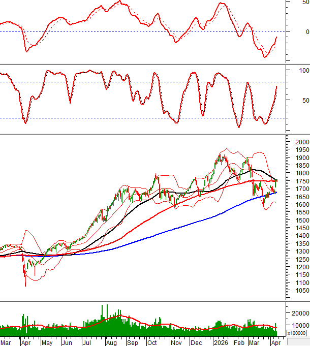 Trong phiên giao dịch sáng ngày 09/04/2026, HNX-Index cũng rung lắc nhưng vẫn nằm trên đường Middle của Bollinger Bands.