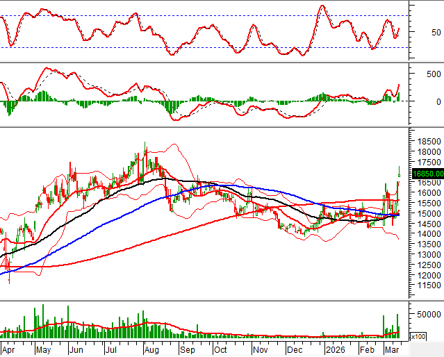 Trong phiên sáng 13/03/2026, giá cổ phiếu tăng phiên thứ 4 liên tiếp đồng thời xuất hiện mẫu nến Rising Window kèm theo khối lượng vượt mức trung bình 20 phiên cho thấy nhà đầu tư tiếp tục giao dịch sôi động.