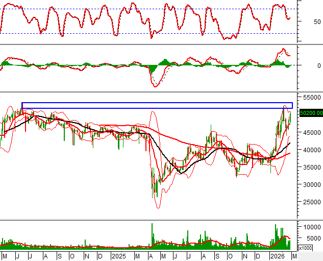 Mặt khác, giá của cổ phiếu IDC đang tiến về đỉnh cũ tháng 06/2024 (tương đương vùng 51,500-53,300) trong khi chỉ báo MACD vẫn nằm trên mức 0 và đang thu hẹp khoảng cách với đường Signal.