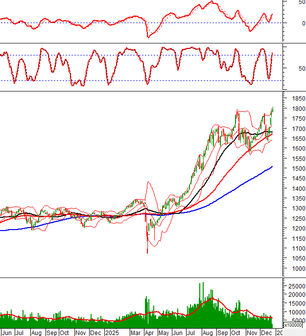 VN-Index tăng trưởng tốt nên khả năng vượt đỉnh cũ tháng 10/2025 (tương đương vùng 1,740-1,795 điểm) là khá cao. Trong khi đó, HNX-Index vẫn đang nằm dưới đường Middle của Bollinger Bands trong bối cảnh Stochastic Oscillator cho tín hiệu bán.