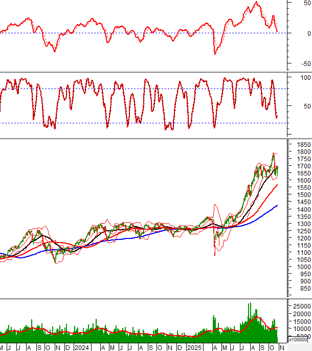 Chỉ báo Stochastic Oscillator cho tín hiệu mua trở lại và đáy cũ tháng 08/2025 (tương đương vùng 1,605-1,630 điểm) trụ vững nên tình hình ngắn hạn khá tích cực.