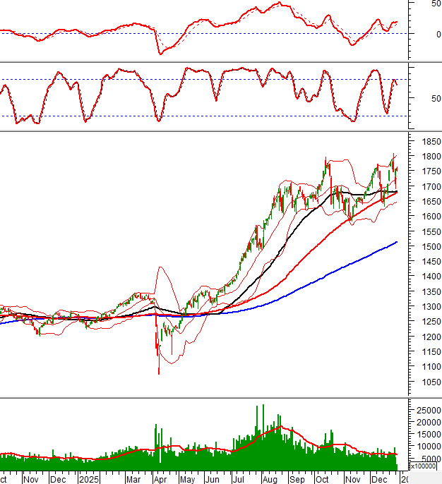VN-Index điều chỉnh và rung lắc khi test lại đỉnh cũ tháng 10/2025 (tương đương vùng 1,740-1,795 điểm). HNX-Index cũng gặp tình trạng tương tự khi mà cả Stochastic Oscillator và MACD đều cho bán trở lại.
