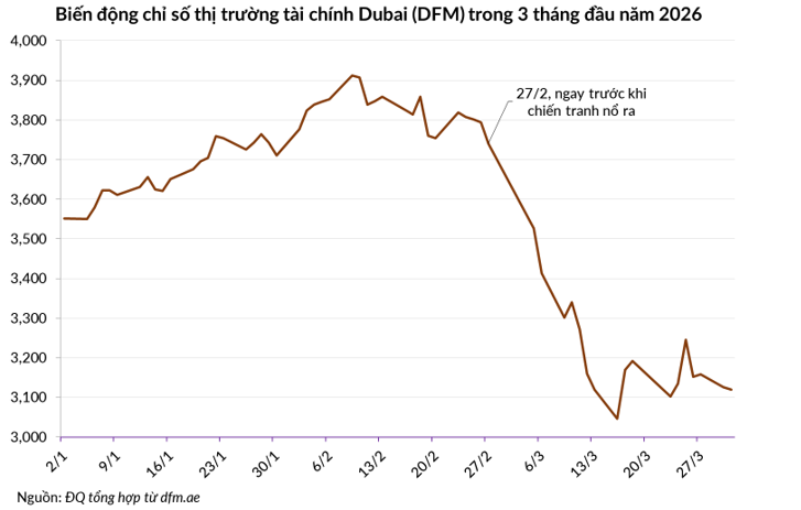 Thị trường tài chính phản ứng gần như ngay lập tức. Chỉ số Thị trường Tài chính Dubai (DFM) giảm 4.8% trong một phiên ngay sau khi chiến tranh nổ ra.