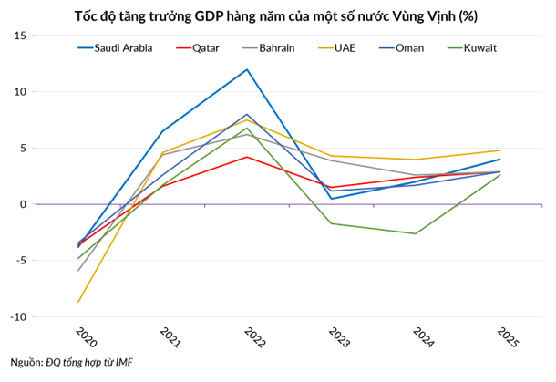 Oxford Economics hạ dự báo tăng trưởng GDP của GCC từ +4.4% xuống -0.2% trong năm 2026. Goldman Sachs ước tính kịch bản xấu có thể khiến GDP Qatar và Kuwait giảm tới 14%. Capital Economics cho rằng GDP của toàn khu vực có thể giảm 10-15% nếu xung đột kéo dài từ 3 tháng trở lên và gây thiệt hại lâu dài tới hạ tầng năng lượng.