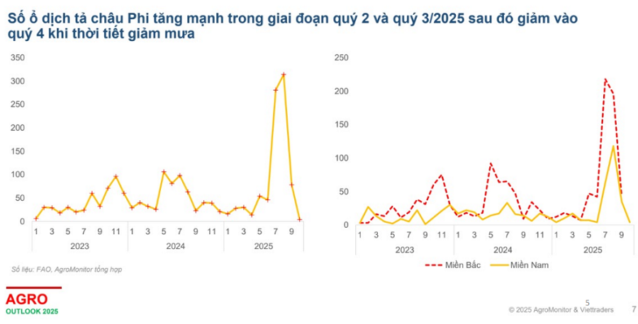 Thứ 2 là vấn đề thiên tai - bão lũ. Các cơn bão như Yagi và các trận lũ lụt tại miền Bắc, miền Trung đã cuốn trôi nhiều trang trại, gây thiệt hại lớn lớn về đàn heo, đặc biệt là tại Nghệ An (nơi có nhiều hộ chăn nuôi nhỏ lẻ). Bão lũ cũng tiếp tục làm tình hình dịch bệnh trở nên trầm trọng hơn. Thống kê từ Agromonitor cho thấy, số ổ dịch ASF đã tăng rất mạnh trong năm 2025, đặc biệt giai đoạn sau quý 2.