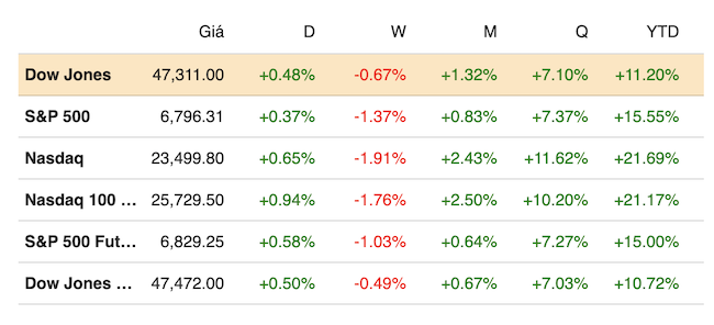 Kết thúc phiên giao dịch ngày 05/11, chỉ số Dow Jones tăng 225.76 điểm (tương đương 0.48%) lên 47,311.00 điểm. Chỉ số S&P 500 cộng 0.37% lên 6,796.29 điểm, còn chỉ số Nasdaq Composite tiến 0.65% lên 23,499.80 điểm.