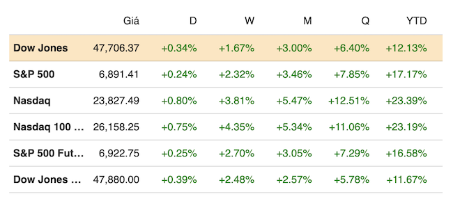 Kết thúc phiên giao dịch ngày 28/10, chỉ số S&P 500 tiến 0.23% lên 6,890.89 điểm. Trước đó, chỉ số này đã vượt mốc 6,900 điểm lần đầu tiên trong phiên. Chỉ số Nasdaq Composite cộng 0.80% lên 23,827.49 điểm, còn chỉ số Dow Jones tăng 161.78 điểm (tương đương 0.34%) lên 47,706.37 điểm. Bên cạnh mức đóng cửa cao kỷ lục, Nasdaq Composite và Dow Jones cũng đạt mức cao mọi thời đại mới trong phiên, cùng với S&P 500.
