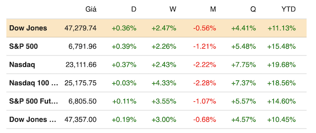 Kết thúc phiên giao dịch ngày 26/11, chỉ số Dow Jones tăng 314.67 điểm (tương đương 0.67%) lên 47,427.12 điểm. Chỉ số S&P 500 cộng 0.69% lên 6,812.61 điểm, còn chỉ số Nasdaq Composite cộng 0.82% lên 23,214.69 điểm.