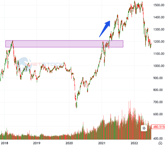 Diễn biến trên khá giống với giai đoạn đầu năm 2021 khi đỉnh cũ tháng 04/2018 (tương đương vùng 1,180-1,215 điểm) bị phá vỡ. Sau khi breakout xuất hiện thì VN-Index tiếp tục bứt phá trong nhiều tháng sau đó. Lịch sử đang lặp lại một lần nữa trong năm 2025.