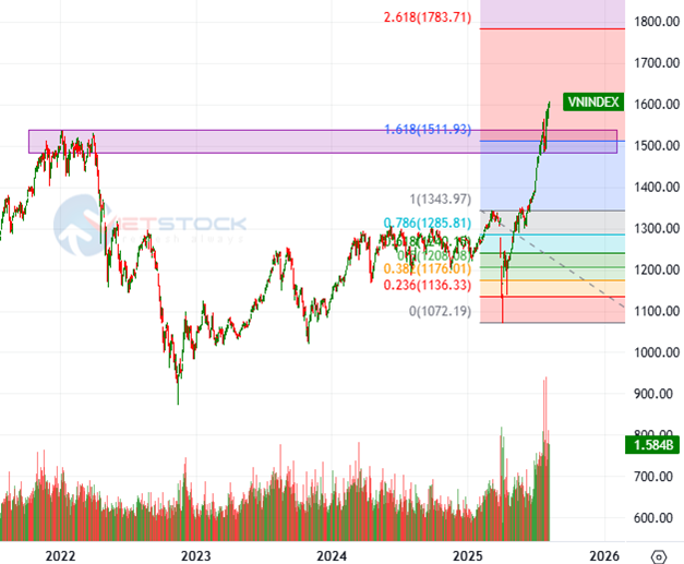 Các nhà đầu tư đã từng có rất nhiều nghi ngờ và thậm chí là lo sợ xoay quanh đỉnh cũ tháng 01/2022 (tương đương vùng 1,500-1,535 điểm). Đặc biệt, sau cú giảm sốc hơn 60 điểm vào ngày 29/07/2025 thì sự sợ hãi ngày càng tăng cao.