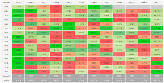 Bảng thống kê hiệu suất ngành tài chính hàng tháng giai đoạn 2010-2025. Đvt: Phần trăm