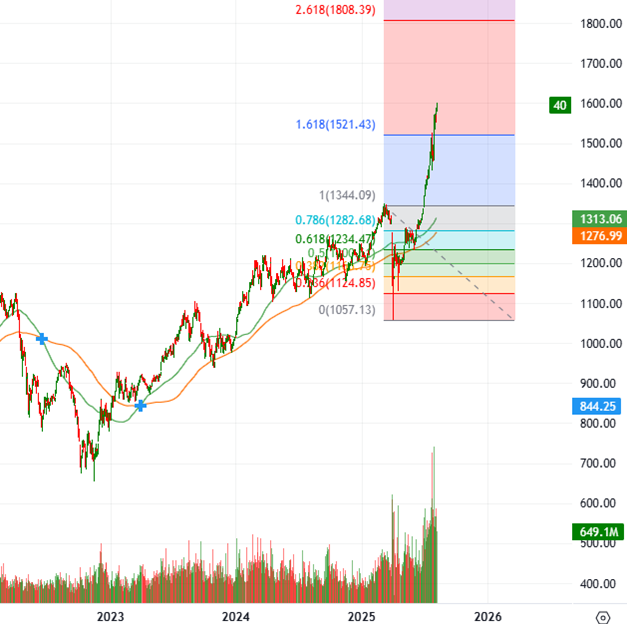 Ngoài ra, chỉ số vừa mới vượt ngưỡng Fibonacci Retracement 161.8% (tương đương vùng 1,520-1,525 điểm) nên sẽ hướng đến mục tiêu mới là Fibonacci Retracement 261.8% (tương đương vùng 1,805-1,810 điểm).
