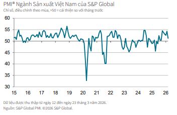 Chỉ số Nhà Quản trị Mua™ hàng (PMI®) ngành Sản xuất Việt Nam của S&P Global vẫn nằm trên ngưỡng 50 điểm trong tháng 3, từ đó kéo dài thời kỳ cải thiện điều kiện kinh doanh hiện nay thành chín tháng. Tuy nhiên, chỉ số PMI đã giảm còn 51.2 so với 54.3 điểm của tháng 2 cho thấy các điều kiện sản xuất có mức cải thiện ít đáng kể nhất kể từ tháng 9 năm ngoái.