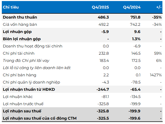 Lũy kế cả năm 2025, Công ty ghi nhận doanh thu thuần 2.1 ngàn tỷ đồng, giảm 6% so với năm trước. Trong khi đó, lỗ ròng lên gần 840 tỷ đồng, đánh dấu 4 năm lỗ nặng liên tiếp.