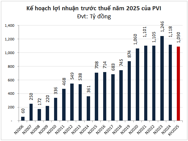 Trên cơ sở nhìn nhận, đánh giá những cơ hội, thách thức và rủi ro, PVI đặt mục tiêu kinh doanh hợp nhất năm 2025 đạt 21,437 tỷ đồng tổng doanh thu và 1,090 tỷ đồng lợi nhuận trước thuế, lần lượt giảm 2% và 3% so với thực hiện năm 2024. Tỷ lệ trả cổ tức dự kiến ở mức 28.5%.