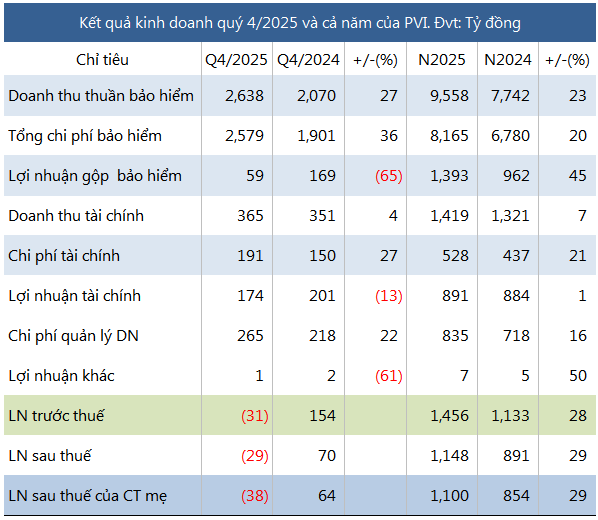 Quý 4/2025, doanh thu thuần bảo hiểm của PVI đạt 2,638 tỷ đồng, tăng 27% so với cùng kỳ, nhờ doanh thu phí bảo hiểm gốc và tái bảo hiểm lần lượt tăng 17% và 19%, trong khi chi phí nhượng tái bảo hiểm tăng chậm hơn (16%).