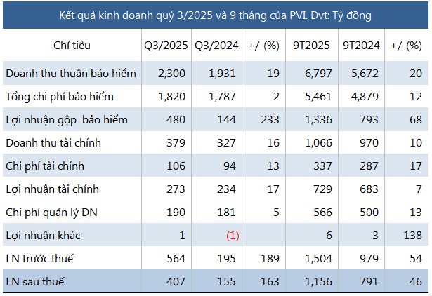 Trong quý 3, PVI lãi ròng 407 tỷ đồng, gấp 2.6 lần cùng kỳ, nhờ lợi nhuận gộp từ mảng bảo hiểm cao gấp 3.3 lần lên 480 tỷ đồng và lợi nhuận tài chính tăng 17%, đạt 273 tỷ đồng.
