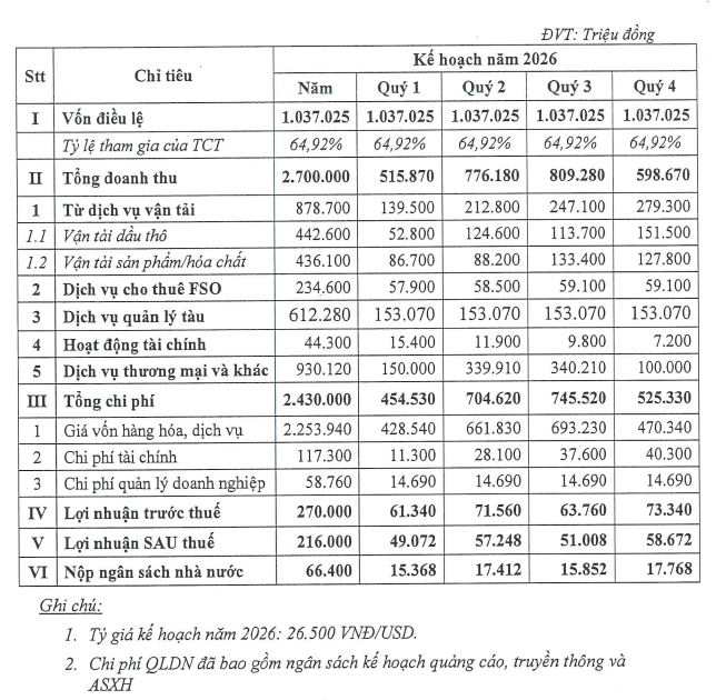 Năm 2026, PVP đặt kế hoạch doanh thu đạt 2,700 tỷ đồng. Nguồn thu chính sẽ đến từ dịch vụ vận tải, quản lý tàu và cho thuê tàu chứa xuất dầu thô (FSO) với tỷ lệ đóng góp lần lượt là 32%, 22.6% và 8.6%. Công ty đặt mục tiêu lãi trước thuế 270 tỷ đồng, lãi sau thuế 216 tỷ đồng.